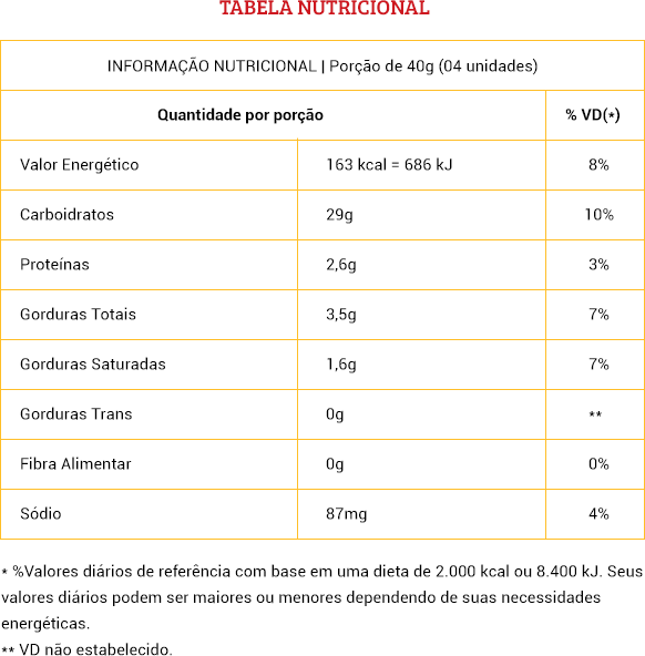 A caixa contém 40 displays, perfeitos para serem distribuídos para uma visita em casa, para serem degustados durante uma viagem ou para qualquer situação que pede por um doce de qualidade!